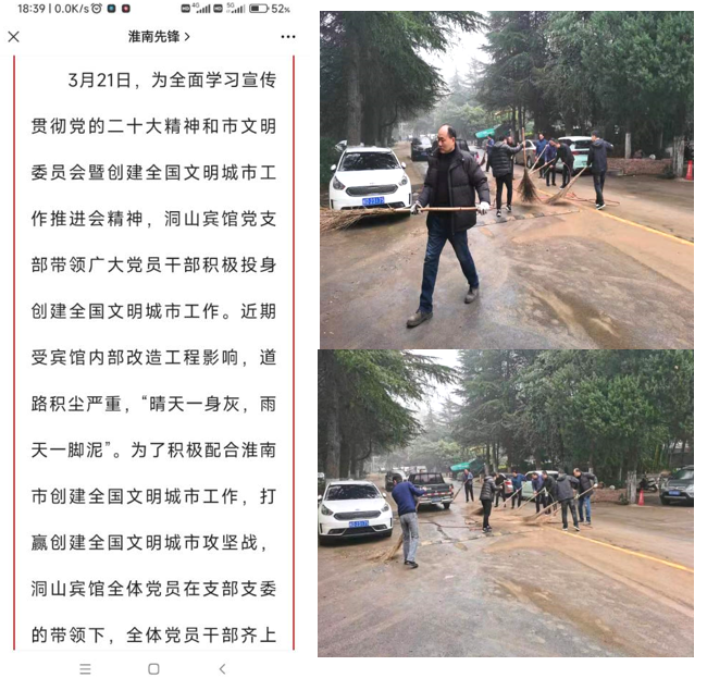 為全面學習宣傳貫徹黨的二十大精神和市文明委員會暨創(chuàng)建全國文明城市工作推進會精神,洞山賓館黨支部以“主題黨日”為契機,帶領廣大黨員干部積極投身淮南市創(chuàng)建全國文明城市工作,打贏創(chuàng)建全國文明城市攻堅戰(zhàn),全體黨員干部齊上陣,不怕臟不怕累,清理了賓館院內路面的垃圾,疏通了道路,為全市創(chuàng)建全國文明城市工作貢獻自己一份力量,此次活動被市委組織部作為優(yōu)秀主題黨日案例發(fā)布于淮南先鋒網。